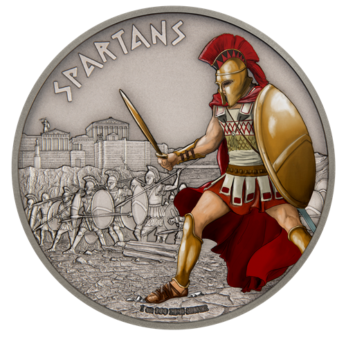 La pièce présente l'illustration colorée d'un soldat spartiate en armure complète, son armée s'approchant d'un champ de bataille à l'arrière-plan.