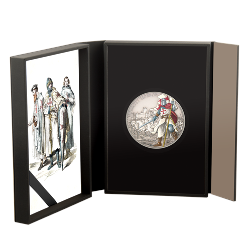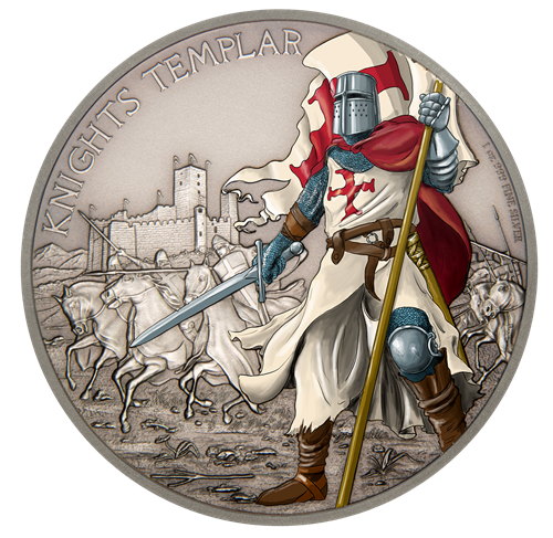 La pièce présente l'illustration colorée d'un Templier; à l'arrière, d'autres chevaliers s'en vont au combat sur leur monture.