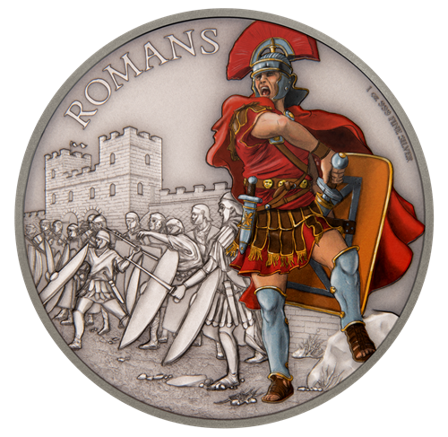 La pièce présente l'illustration colorée d'un soldat romainau premier plan, tandis que d'autres sont en pleine action derrière.