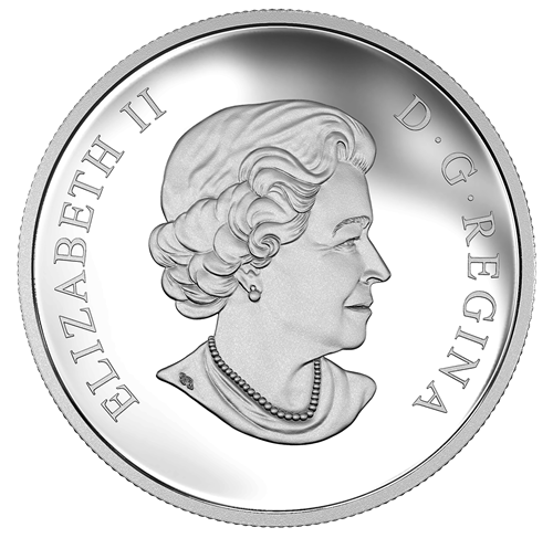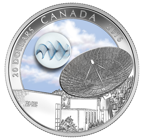 Œuvre de l'artiste canadien Ardell Bourgeois, le motif de la pièce représente l'Observatoire fédéral de radioastrophysique du CNRC, situé près de Penticton, en Colombie-Britannique. Contre un arrière-plan montagneux et boisé au nord, le télescope de 26 mètres John A. Galt est pointé vers le ciel pour capter et transmettre les ondes radio provenant de l'espace. Les teintes douces d'un ciel bleu parsemé de légers nuages offrent une magnifique toile de fond à l'édifice gravé au premier plan, qu'on reconnaît aisément à son enseigne NRC-CNRC. Au grand jour, le ciel coloré cache un élément spectaculaire qui se révèle par photoluminescence dans l'obscurité : ce sont les étoiles qu'on voit la nuit au-dessus de l'Observatoire. À gauche, un ornement en verre léger mais résistant, réalisé à la main par l'artiste Loïc Beaumont-Tremblay, présente une interprétation artistique d'un signal radio capté par le télescope. On obtient la forme d'onde recherchée en travaillant à des températures extrêmement élevées avec un mélange de verre et de vapeur d'argent; sous l'effet de la luminescence, l'onde brille d'unéclat étonnant qui convient parfaitement à cette mise en valeur, par la numismatique, d'un exploit de l'astrophysique.