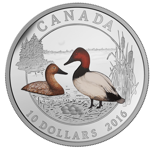 - Admirablement conçue par l'artiste saskatchewanais Glen C.Scrimshaw, cette pièce en argent pur à 99,99 %, méticuleusement gravée et colorée de façon sélective, rend hommage à la beauté des gibiers d'eau du Canada en mettant en vedette un couple de fuligules à dos blanc dans son habitat naturel.