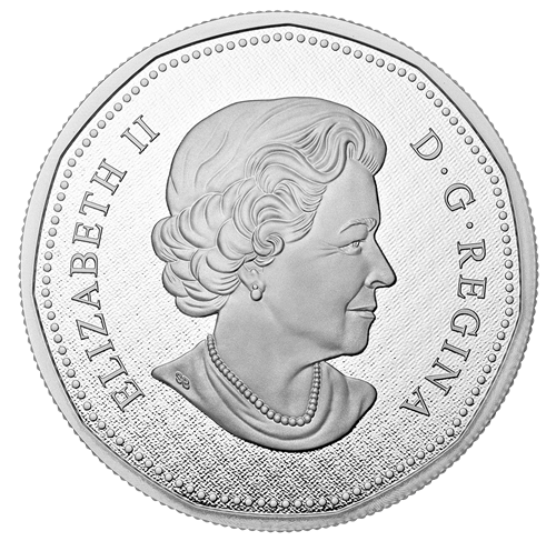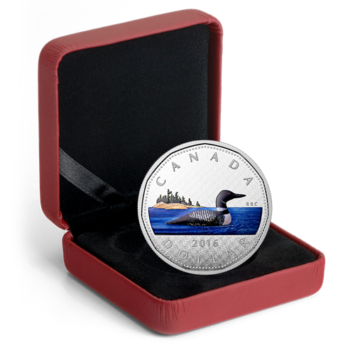 Caractéristiques particulières- Cette pièce de 1 $ frappée dans 5 onces d'argent fin est ornée d'un motif représentant un plongeon huard, une création de l'artiste animalier canadien de renom Robert-Ralph Carmichael. Ce motif a été utilisé pour la première fois sur la pièce de circulation de 1 $ lancée en 1987. Depuis lors, ce motif est frappé sur toutes les pièces canadiennes de 1 $, à quelques exceptions près.