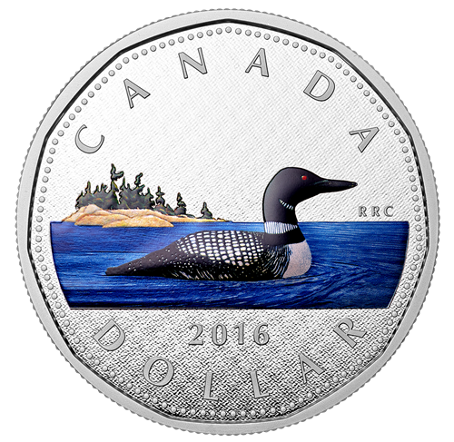 Le motif au revers, œuvre de l'artiste canadien Robert Carmichael, représente un plongeonhuard, vu de profil, flottant sur les eaux calmes d'un lac ainsi qu'une petite îlepeuplée de conifères à gauche, en arrière-plan. Le plongeon huard, le lac et l'île bordée d'arbres sont rehaussés d'une coloration sélective. Sont également gravés au revers les mentions « CANADA » et « DOLLAR » ainsi que le millésime « 2016 ». L'aversest à l'effigie de Sa Majesté la reine Elizabeth II, selon Susanna Blunt.