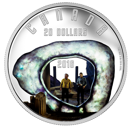 Le motif de la pièce fait revivre une scène marquante de Star Trek tirée de l'épisode Contretemps, diffusé en 1967. Des couleurs vives confèrent une touche de réalisme au portrait gravé du capitaine James T. Kirk (incarné par l'acteur canadien William Shatner) et de monsieur Spock (incarné par Leonard Nimoy). Vêtus de leur célèbre uniforme de Starfleet, ils se trouvent parmi des ruines devant le Gardien de l'éternité, un énorme portail en forme d'anneau. L'utilisation de la technologie de réalité augmentée met en valeur le motif dans son ensemble en recréant la luminosité du portail à voyager dans le temps, véritable source d'émerveillement. Figurent aussi au revers la mention « CANADA », la valeur nominale « 20 DOLLARS » et le millésime « 2016 », gravés en caractères d'écriture de Star Trek.