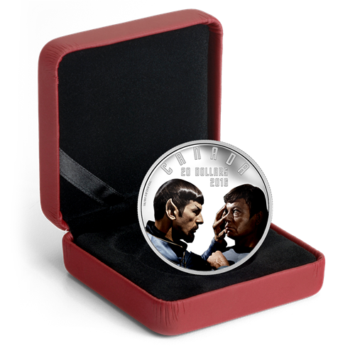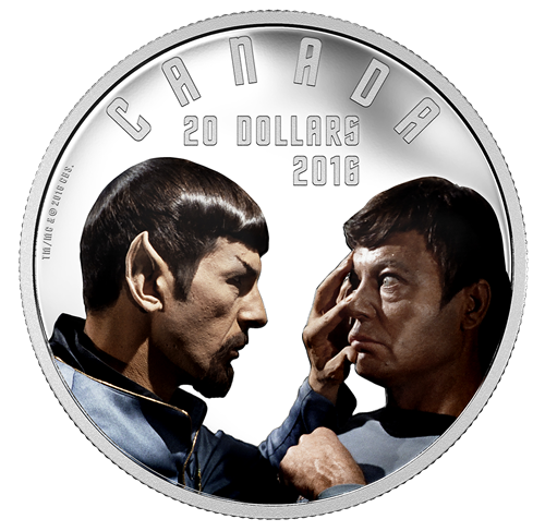 Le motif de la pièce fait revivre une scène marquante du mémorable épisode Miroir de Star Trek, diffusé en 1967. Rehaussé d'une coloration sélective, il représente le double altéré de Spock (incarné par Leonard Nimoy) en train d'infliger une fusion mentale vulcaine au docteur Leonard« Bones » McCoy (incarné par DeForest Kelley). McCoy a l'air effrayé sous l'emprise de ce Spock qui porte une barbiche inhabituelle et un uniforme modifié. Ces anomalies prouvent bien que les membres de l'équipage ont été téléportés dans un univers parallèle, où leurs collègues se comportent bien étrangement.Figurent aussi au revers la mention « CANADA », la valeur nominale « 20 DOLLARS » et le millésime « 2016 », gravés en caractères d'écriture de Star Trek.
