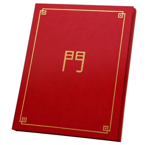 - un luxueux coffret pliable en similicuir rouge orné d’un gaufré représentant un portail bien connu en Chine.