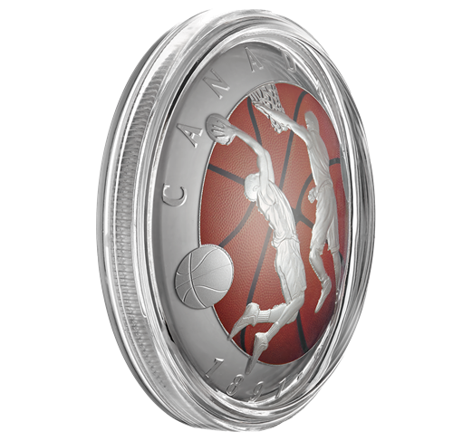 - L'histoire du ballon est, elle aussi, fascinante : le ballon de soccer utilisélors des premiers matchs fut délaissé en 1894 pour faire place au tout premier ballon de basket-ball. Ce dernier, fait de lanières de cuir brun entrelacées, différait considérablement des ballons de basket-ball bondissants qui sont fabriqués de nos jours! Conçu tantôt pour les passes, tantôt pour les dribbles, il évolua au fil du temps, s'adaptant graduellement aux nouvelles exigences du jeu. C'est dans ce contexte qu'il obtint finalement sa célèbre couleur orange vif. Celle-ci rehausse par ailleursl'arrière-plan au revers de la pièce, dont la courbure attire l'œil et constitue un véritable exploit technique.