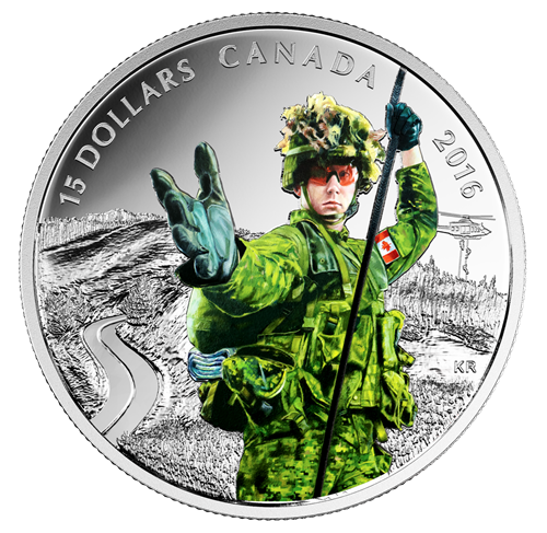 Rehaussé d'une coloration sélective, le motif gravé au revers, œuvre de l'artiste canadien Ken Ryan, saisit sur le vif un acte de bravoure. Àl'arrière-plan, des arbres et des branches surplombent une zone de conflit boisée où des hélicoptères militaires prennent part à des opérations de sauvetage. À l'avant-plan, un soldat d'infanterie en tenue de combat, agrippé d'une main à une corde de descente en rappel, tend l'autre main vers nous comme pour nous porter assistance. Le rouge et le blanc de l'écusson du drapeau canadien sur le haut de la manche gauche se détachent clairement du motif decamouflage vert, brun et noir du casque et de l'uniforme. L'expression du soldat témoigne de son intense concentration pour accomplircette dangereuse opération de sauvetage.