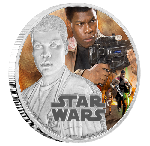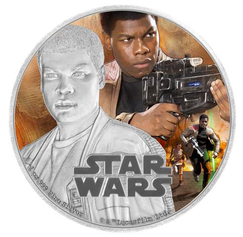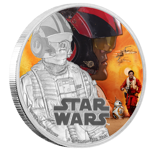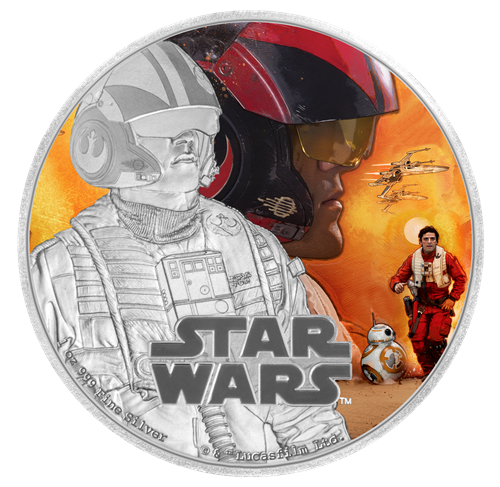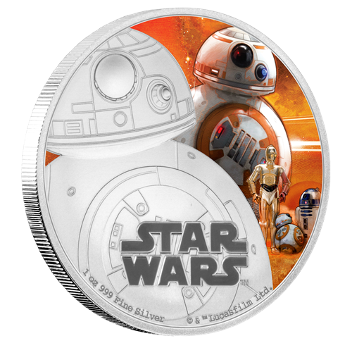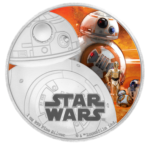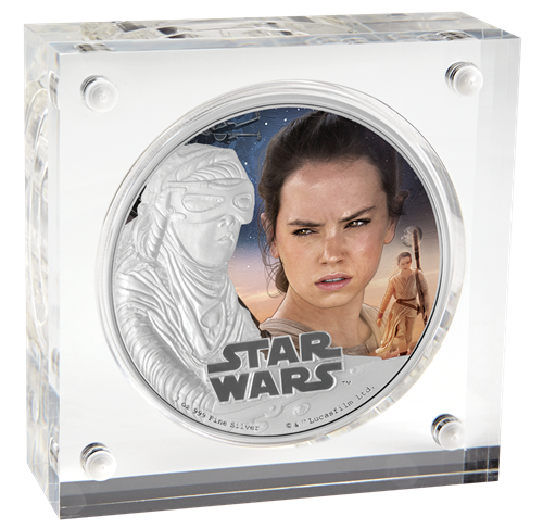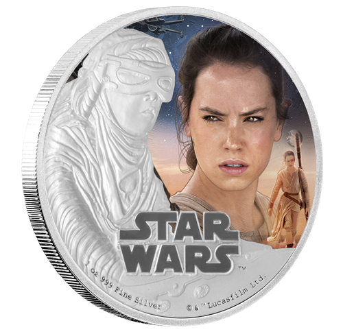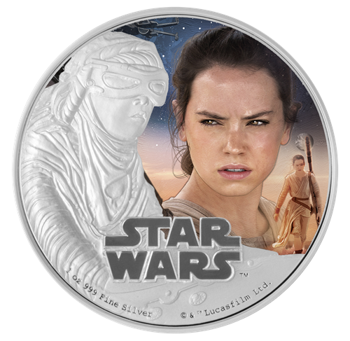 La troisième émission est la pièce de 1 oz en argent consacrée au personnage de Rey. Cette pièce impressionnante montre une représentation frappante de Rey, nouveau personnage très attendu de La Guerre des étoiles. Rey vit dans un cimetière d'épaves sur une planète désertique appelée Jakku. Autonome et solitaire, elle est une survivante endurcie par une viepassée à se défendre contre les assassins du désert.