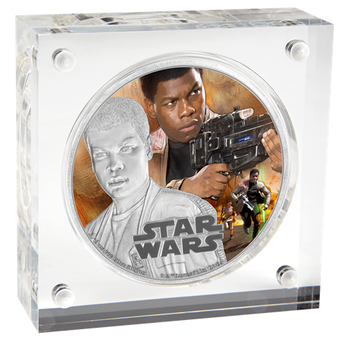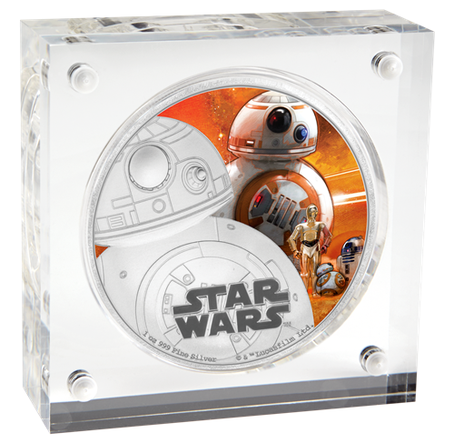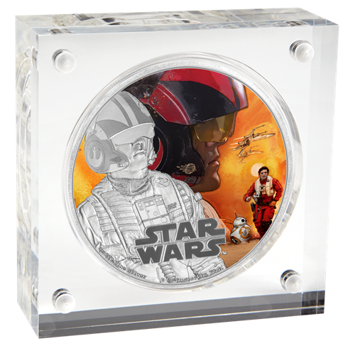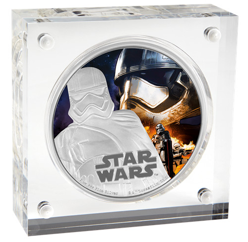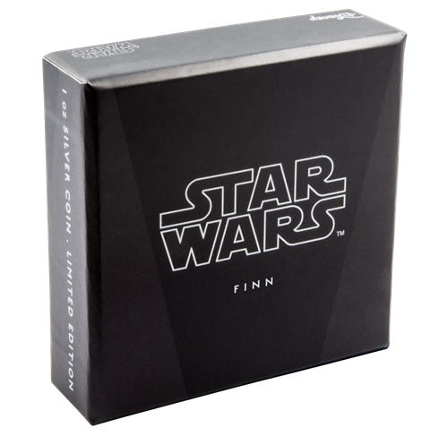 Les pièces de 1 oz enargent Star Wars : Le Réveil de la Force sont présentées dans un mince bloc en Perspex de haute qualité, lequel est assorti d'une boîte protectrice illustrée sur le thème de La Guerre desétoiles. L'emballage contient un certificat d'authenticité.