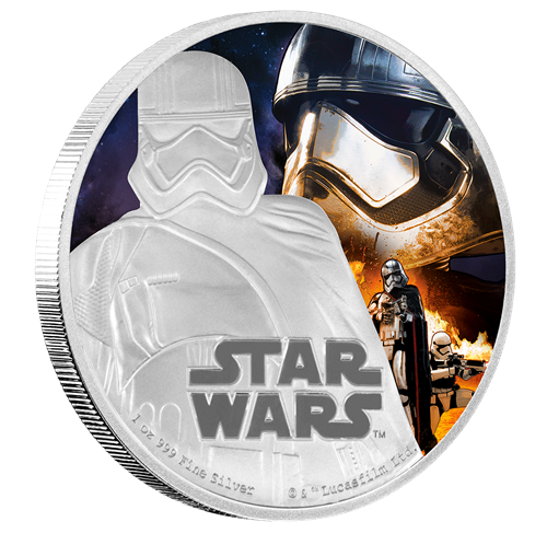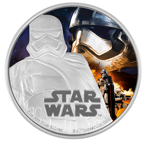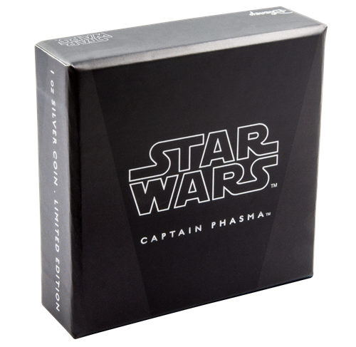 La deuxième émission de la série est la pièce de 1 oz enargent mettant en vedette la Capitaine Phasma. Cette pièce impressionnante montre une représentation colorée de la capitaine Phasma, nouveau personnage très attendu de La Guerre des étoiles. On aperçoit la capitaine Phasma, commandante des légions de troupiers du Premier Ordre, revêtue de son armure métallique caractéristique.