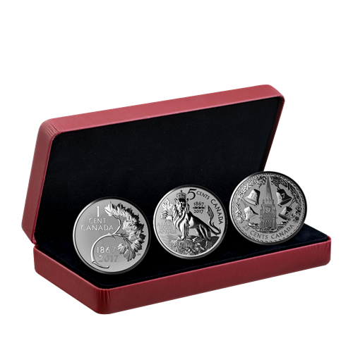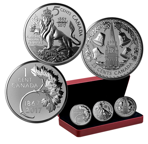 Les trois pièces sont ornées d'un motif inédit d'abord destiné à marquer le jubilé dediamant du Canada en 1927. Ne disposant de guère plus que les croquis originaux, les graveurs de la Monnaie royale canadienne ont interprété la vision de chaque artiste comme si les œuvres leur avaient été tout juste confiées, pour souligner le 150e anniversaire de la Confédération. Vieux de 90 ans, les concepts ont été méticuleusement adaptés aux techniques de gravure modernes; un fini épreuve inverse a notamment été utilisé pour faire ressortir les éléments gravés, qui brillent sur le champ mat.