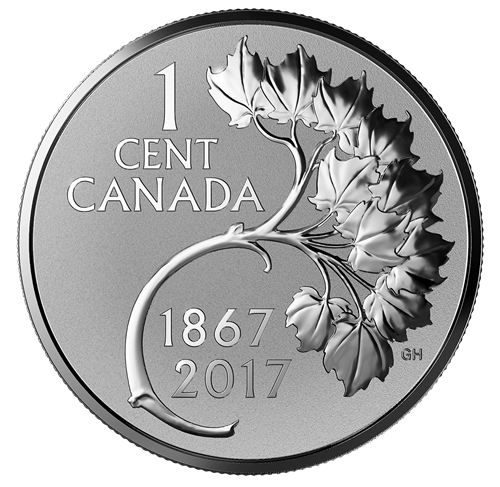 Sur la pièce de 1 cent figure le motif d'inspiration Art nouveau créé par l'artiste canadien Gustav Hahn (1866-1962) : une branche de feuilles d'érable entourant les dates commémoratives « 1867-2017 ».