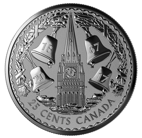 Le revers de la pièce de 25 cents est également orné d'un motif de J. E. H. MacDonald, qui propose une vueaérienne de l'emblématique tour de la Paix surla Colline du Parlement. Le clocher, qui s'élève bien au-delà des nuages, est entouré de lauriers enrubannés auxquels sont suspendues quatre cloches –un hommage au carillon de la Tour, inauguré le 1er juillet 1927 à l'occasion du jubilé de diamant. Sur chaque cloche sont gravés des chiffres qui, ensemble, forment les dates commémoratives « 2017 » et « 1867 ».