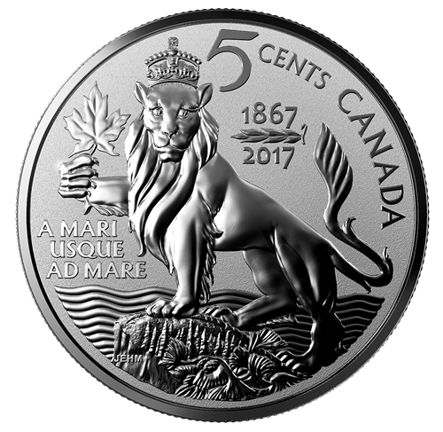 Œuvre de l'artiste canadien J. E. H. MacDonald (1873-1932), la pièce de 5 cents illustre un lion couronné tenantà la patte une feuille d'érable. L'animalest sur un rocher entouré d'eau représentant les paysages variés du Canada. La devise du pays, « AMARI USQUE AD MARE » (D'un océan à l'autre), est inscrite sous la patte avant du lion, et lesdates commémoratives « 1867-2017 » figurent à ses côtés..