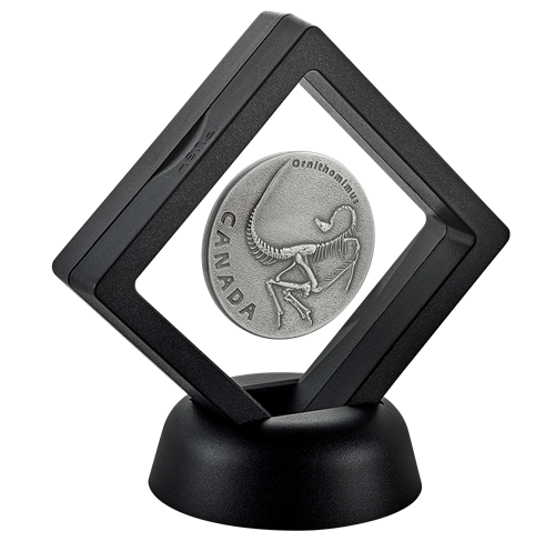 La première pièce de la série reproduit le spécimen fossile TMP 1995.110.1, conservé au Royal Tyrrell Museum of Palaeontology de Drumheller, en Alberta. Le contour inhabituel de cette pièce sans cordon est le fruit d'une technique de monnayage ancienne qui permet à l'argent fin de déborder, produisant ainsi une forme irrégulière qui rappelle celle de lamonnaie romaine antique. À l'opposé, la technologie et les techniques de finition d'avant-garde donnent une apparence lisse au fossile gravé de l'Ornithomimus, dinosaure à plumes dont l'éclat contraste avec la texture du « grès » dans lequel il est incrusté et qui couvre entièrement le champ. Le tout évoque un passé indéniablement lointain; la pièce doit aussi son apparence antique à son fini patiné, et aux caractèresà l'allure préhistorique qu'elle arbore sur les deux faces.
