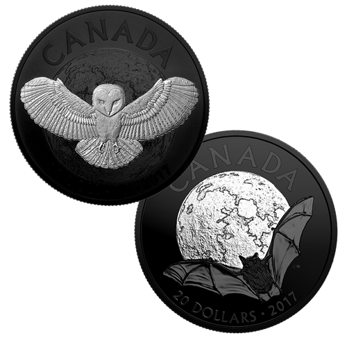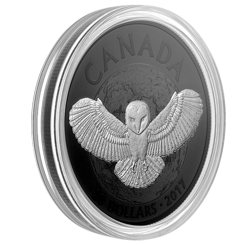 La première pièce de la série, œuvre de l'artiste canadien Jamie Desrochers, est une représentation stylisée et contemporaine d'une effraie des clochers (Tyto alba) qui plonge vers le sol, le tout du point de vue de sa proie tournée vers le ciel nocturne. En arrière-plan, l'utilisation novatrice du placage de rhodium noir crée une splendide toile de fond pour cette scène de nuit; la gravure détaillée reproduit lescratères de la pleine lune, qui s'illumine grâce au fini givré brillant à travers le placage foncé. La surface argentée de la pièce évoque aussi à merveille la lueur du clair de lune sur l'effraie gravée à l'avant-plan, qui semble plus resplendissante contre le champ sombre. En plein vol, les ailes bien déployées et le regard fixe, le rapace furtif s'impose comme un redoutable chasseur, donnant l'impression de fondre sur l'observateur. La gravure rend les traits les plus distinctifs de l'animal, de son masque facial en forme de cœur à ses serres acérées en passant par sa queue et ses ailes mouchetées.