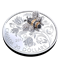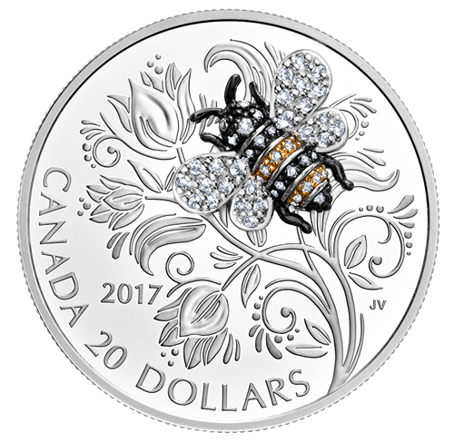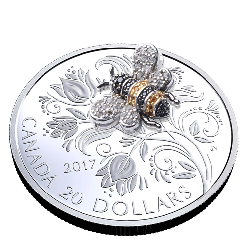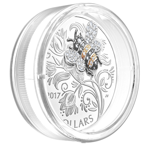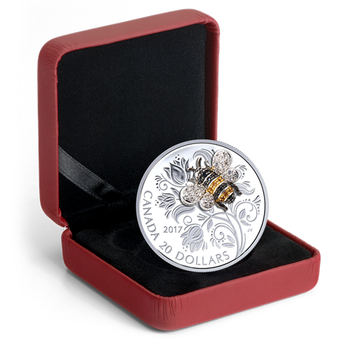 Œuvre de l'artiste canadienne Jori van der Linde, lemotif propose une représentation magnifiquement stylisée d'une abeille. L'arrière-plan, inspiré des tulipes en fleurs et des tiges vrillées du pois, se veut une composition florale contemporaine évoquant un jardin fantaisiste de fleurs, de feuilles et de fioritures spiralées. Tous ces éléments sont méticuleusement ciselés, puis parfaitement définis grâce à un superbe fini épreuve numismatique qui rehausse l'éclat du placage de rhodium sur l'abeille. Tel un bijou, l'insecte est serti d'un fascinant éventail de pierres précieuses et semi-précieuses : des saphirs noirs ronds ornent sa tête, son thorax et son abdomen; des citrines sont placées sur le placage d'or afin de recréer les bandesjaunes caractéristiques; et des topazes blanches donnent aux ailes délicates un scintillement incolore qui imite les reflets du soleil.