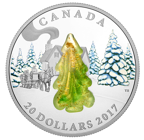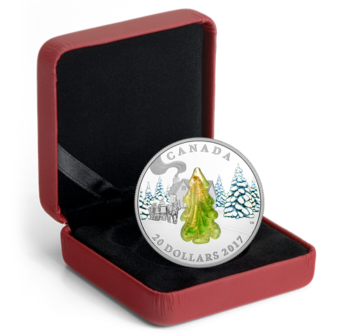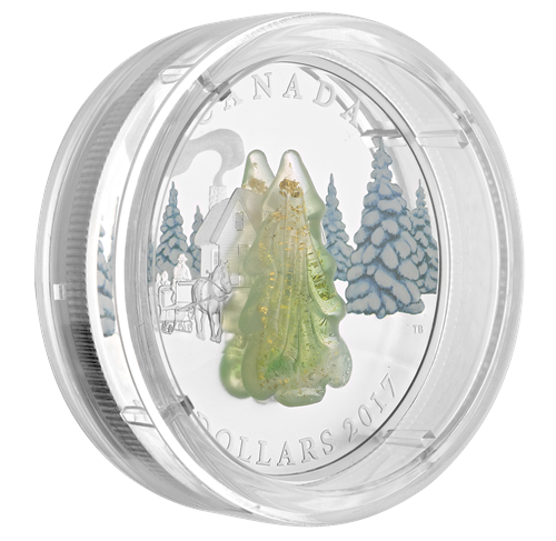 La motif au revers, œuvre de l'artiste canadien Tony Bianco, représente une scène traditionnelle de l'hiver canadien, dont elle rend la paisible beauté. La campagne sommeille sous sa couverture de neige fraîche. Dans l'air piquant du matin, trois personnes font une promenade en traîneau. La gravure minutieuse met en valeur toute la complexité des détails du traîneau tiré par un cheval ainsi que ses occupants. À gauche de la pièce, le traîneau avance dans la neige immaculée et passe devant un chalet en bois. Un panache de fumée s'élève de la cheminée, promesse d'une douce chaleur auretour. Le bosquet de pins que traverse le traîneau est semblable à du cristal, le vert des aiguilles et des branches presque invisible sous le lumineux manteau de neige. Un splendide arbre en verre de Murano, fabriqué à la main par les maîtres verriers Giorgio et Bernardino Vio, à Murano, en Italie, occupe le centre de la composition. La délicate beauté de cet ornement évoque à merveille l'éclat cristallin de la neige et de la glace quidominent le paysage. L'arbre en verre de Murano est différent d'une pièce à l'autre; chaque pièce est donc véritablement unique!