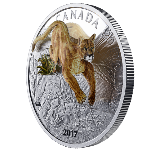 Le motif tridimensionnel, œuvre de Matt Bowen, graveur à la Monnaieroyale canadienne, représente de façon saisissante un couguar (Puma concolor) bondissant. L'élément tridimensionnel est le fruit d'un procédé appelé thermoformage, qui immortalise les moindres détails du grand félin, de sa longue queue à ses grosses pattes avant, sans oublier ses yeux toujours aux aguets.Transférant son poids sur ses pattes postérieures longueset musclées, l'animal en relief s'élance,semblant bondir hors de la surface de la pièce! Derrière lui, des détails finement ciselés forment une toile de fond superbe; dans ce paysage rocheux et semi-ouvert, le couguar semble parfaitement chez lui. La coloration sélective rehausse ce chasseur discreten recréant sa fourrure brun-roux, ses yeux verts, et les couleurs contrastantes de son museau.
