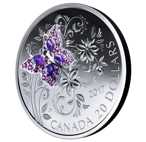 - UNE PREMIÈRE! Voici notre toute première pièce en argent pur à 99,99 % embellie d'un papillon serti de gemmes.