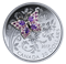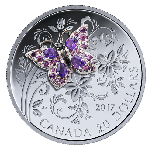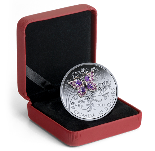 Le motif hautement stylisé, œuvre de l'artiste canadienne Jori van der Linde, est une célébration multidimensionnelle de la splendeur lumineuse du papillon. Inspirée des fleurs de la jonquille et des tiges vrillées du pois, une composition florale contemporaine y crée un jardin fantaisiste où se côtoient fleurs à cinq pétales, bourgeons, feuilles et fioritures spiralées. Tous ces éléments sont méticuleusement ciselés, puis mis en valeur par un fini épreuvenumismatique qui rehausse à la fois la lumière naturelle et l'éclat du papillon. Tel un bijou, ce dernier attire le regard avec son assortiment de pierres précieuses et semi-précieuses : un saphir noir rond représente sa tête, quatre améthystes piriformes ajoutent un accent violacé à ses ailes, et un arrangement de rhodolites lui apporte ses riches teintesframboise.