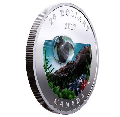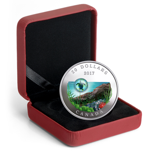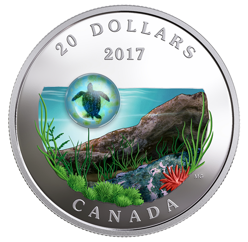 Le motif, œuvre de l'artiste canadien Maurice Gervais, nous donne un aperçu du monde sous-marin au large des côtes canadiennes. La couleur appliquéesur la gravure minutieuse met en valeur les coraux, les algues et les roches qui se trouvent sous de petites vagues. Du côté gauche,un ornement fait à la main par le verrier canadien Loïc Beaumont-Tremblayprésente un élément en murrine évoquant une tortue marine. La technique de la mosaïque appliquée au verre est idéale pour recréer l'aspect distinctif de l'animal, dont sa carapace, ses pattes griffues et sa queue.Placé de sorte qu'il évoque le mouvement de la tortue dans l'eau, l'élément en murrine est lui-même protégé par une « carapace »faite de verre borosilicaté. Sont également gravés au revers la mention « CANADA »,le millésime « 2017 » et la valeur nominale « 20 DOLLARS ». L'avers est à l'effigie de Sa Majesté la reine Elizabeth II, selon Susanna Blunt.