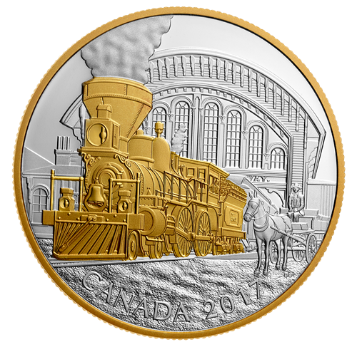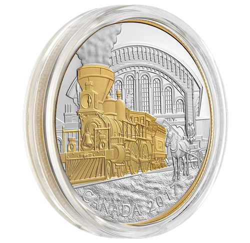 Œuvre de l'artiste canadien David A. Oram, lemotif de la pièce nous transporte à Toronto, en Ontario, en 1867, année de la Confédération. Immédiatement, le regard est attirépar le placage d'or sélectif qui orne la locomotive 4‑4‑0 du grandChemin de fer Occidental, à l'avant-plan. La vue de trois quarts sur la gauche permet d'examiner attentivement les traits caractéristiques de ce véhicule à vapeur – de son épaisse colonne de fumée à sesimposantes roues motrices en passant par son chasse-pierres –, tous rendus avec uneprécision remarquable. À l'arrière-plan, l'arc décrit par le quai couvert de la gare de voyageurs dela rue Yonge ajoute un point d'intérêt architectural à la scène, tandis qu'une voiture hippomobile arrêtée au bord des rails complète cette représentation méticuleusement gravée d'une époque lointaine.