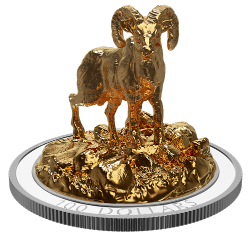 - UNE PIÈCE REMARQUABLE DE LA MONNAIE ROYALE CANADIENNE! En raison de son grand diamètre (65 mm), cette pièce est la toile de fond tout indiquée pour accueillir le mouflon d'Amérique qui émerge de son revers. La statuette en argent estrehaussée d'un placage d'or.