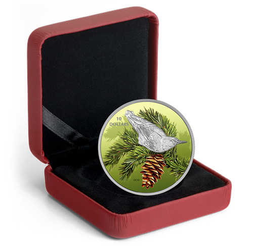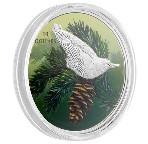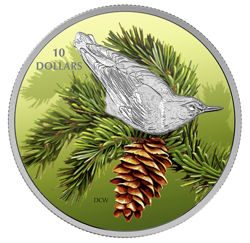 La sittelle illustrée sur la pièce attire particulièrementle regard, perchée sur la branche piquante d'une épinette blanche (Picea glauca). Souvent choisi comme arbre de Noël au Canada, ce conifère à feuillage persistant est monnaie courante dans la forêt boréale qui s'étend de Terre-Neuve-et-Labrador à la Colombie-Britannique, et jusqu'à la limite septentrionale des arbres. Il sertd'abri à bien des animaux des bois, et les graines que produisent ses cônes nourrissent de nombreuses espèces d'oiseaux, dont la sittelle.