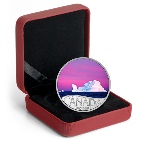 Au revers de la pièce, le motif finement gravé et rehaussé de couleurs vives, inspiré d'une image du photographe canadien Dale Wilson, représente une scène impressionnante qui se déroule à la pointe est du Canada. D'avril à la mi-juin, des icebergs dérivent fréquemment au large de Terre-Neuve-et-Labrador, l'une des meilleures destinations au monde pour les observer. Sur la pièce, les superbes teintes roséeset pourpres de l'aube servent de toile de fond à l'un de ces géants glacés, d'une blancheur immaculée, qui défile dans le « couloir d'icebergs »près de Twillingate, qualifiée de « capitale mondiale des icebergs ». Sont également gravées au revers la mention « CANADA » et les dates « 1867-2017 », qui soulignent le 150e anniversaire de la Confédération.