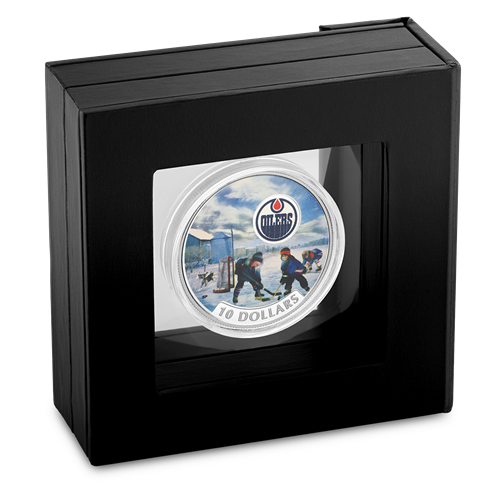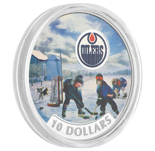 D'un océan à l'autre, peu importe la saison, des jeunes se réunissent sur la glace ou dans la rue pour jouer au hockey. Ils perpétuent ainsi une tradition intemporelle et incarnent l'essence même du sport! La pièce en argent pur met en lumière une passion qui anime le pays depuis plus d'un siècle et célèbre la fidélité des partisans des équipes canadiennes de la LNHMD –dont ceux des Edmonton OilersMD.