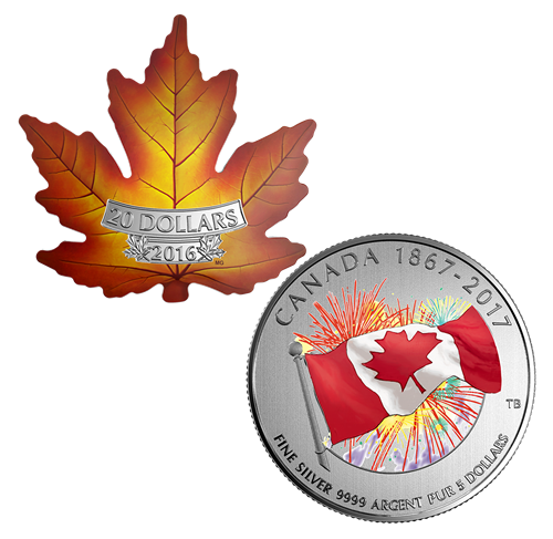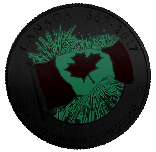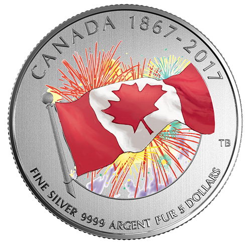 Œuvre de l'artiste canadien Tony Bianco, la pièce représente l'unifolié, gravé et coloré, sur fond de feux d'artifice. À l'avant-plan, saisi en légère contre-plongée, le drapeau rouge et blanc bat vigoureusement au vent. À l'arrière-plan, de grandes gerbes de feux d'artifice aux couleurs éclatantes explosent dans le ciel. Grâce à la photoluminescence, ces feux d'artifice révèlent un spectacle encore plus impressionnant dans la noirceur. Sont gravées au revers les mentions « CANADA » et« FINE SILVER 9999 ARGENT PUR », la valeur nominale« 5 DOLLARS » et les dates commémoratives « 1867-2017 ». L'avers est à l'effigie de Sa Majesté la reine Elizabeth II, selon Susanna Blunt.