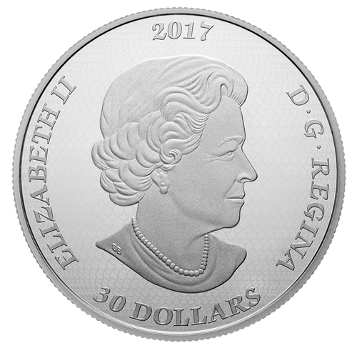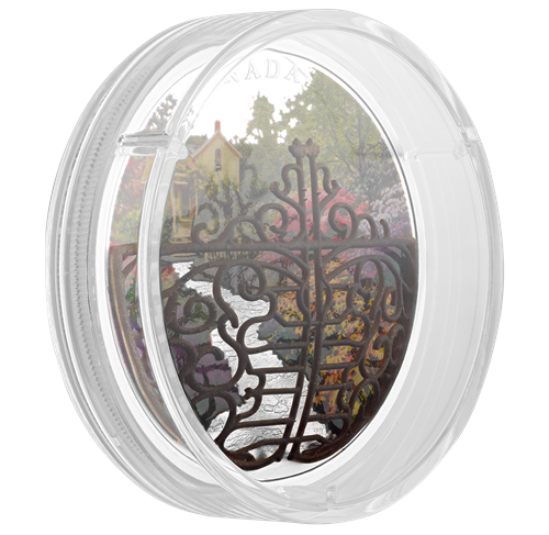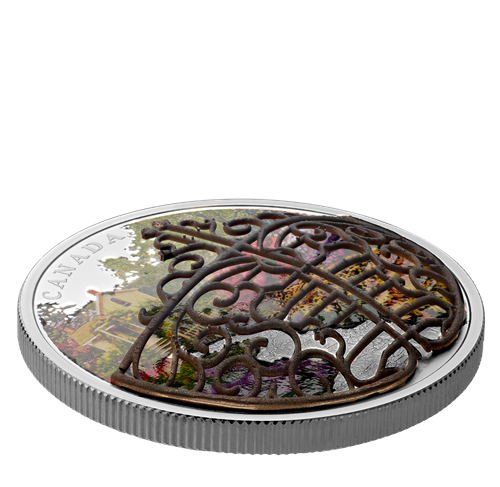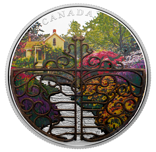 Inspiré des jardins d'un bout à l'autre du Canada, le motif rend hommage à la beauté de lanature et aux réalisations artistiques de nos jardiniers. Au premier coup d'œil, la pièce donne une envoûtante impression de mystère, grâce au portail qui s'étend sur son revers. Façonné dans du bronze blanc d'après un motif du 18e siècle, ce portail de jardin en filigrane, œuvre de l'artiste canadienne Margaret Best, est si finement ouvragé que sa délicatesse en déguise la solidité. En raison de son grand diamètre (50 mm), la pièce peut accueillir un grand nombre de détails gravésque rehausse une ravissante palette de couleurs. Derrière le portail, nous sommes invités à suivre un sentier de pierres menant à une maisonnette et bordé par un jardin estival enchanteur. Conçu par l'artiste canadien Tony Bianco, ce jardin rassemble certaines des plantes vivaces favorites des Canadiens : un rosier grimpant, une hydrangée, des phlox, des monardes écarlates, de la sauge sclarée et des rudbeckies. Elles sont toutes en fleurs, ce qui rend ce paysage pittoresque encore plus idyllique. L'avers est à l'effigie de Sa Majesté la reine Elizabeth II, selon Susanna Blunt.