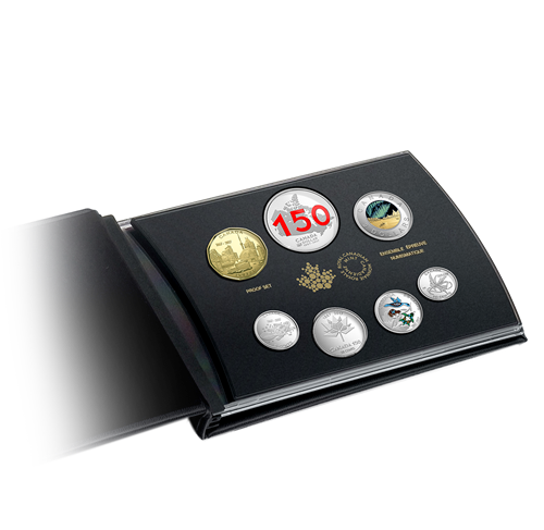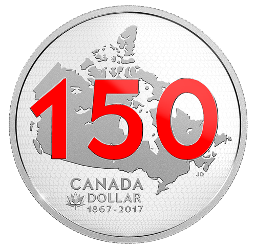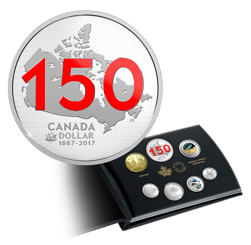 L'ensemble comprend également une pièce de 50 cents ornée du logo officiel CANADA 150, soit une mosaïque formant une feuille d'érable, ainsi qu'une pièce de résistance : un dollar épreuve numismatique en argent pur à 99,99 % édition limitée, œuvre de l'artiste Jamie Desrochers. L'image microgravée à l'arrière-plan présente des milliers de feuilles d'érable disposées de façon arrondie pour donner l'impression d'un globe. Représentant la nation, une carte du Canada se trouve au centre de la pièce; le nombre « 150 » est gravé au-dessus. La grande taille de ce dernier reflète l'importance de cette année historique, tandis que l'application de rouge rappelle le drapeau national.En dessous de la carte sont gravées, dans la policeofficielle qu'a adoptée pour l'occasion Patrimoine canadien, les mentions « CANADA » et « DOLLAR » et les dates commémoratives « 1867-2017 »; le logo CANADA 150 se trouve à côté. L'avers est àl'effigie de Sa Majesté la reine Elizabeth II,selon Susanna Blunt.