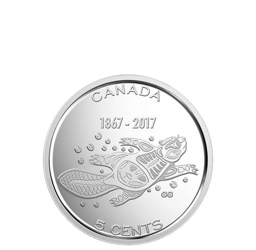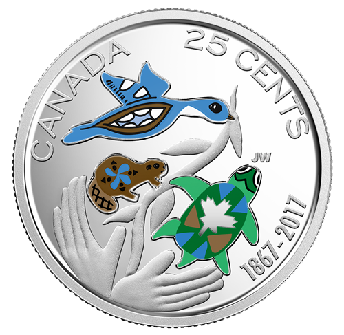 Les motifs gravés au revers de chaque pièce,y compris les cinq de la collection Mon Canada m'inspire, ont été conçus par des Canadiens pour les Canadiens, et seront seulement frappés à l'occasion du 150e anniversaire du Canada. La pièce de deux dollars, La danse des esprits, met à l'honneur les merveilles du Canada grâce à son motif représentant des pagayeurs avançant doucement sur un lac calme, sous le voile scintillant d'une aurore boréale. La pièce de circulation de un dollar, Le lien d'une nation, rend hommage aux chemins de fer qui ont rassemblénotre population – et aux nombreux points d'intérêt impressionnants qui les jalonnent. La pièce de25 cents, Pour l'avenir de notre environnement, incarne l'espoir d'un enfant qui souhaite voir la richesse de la naturecanadienne préservée pour les années à venir : deuxmains soutiennent une plante, à laquelle sont connectées toutes les espèces vivantes. La pièce de 10 cents, Les ailes de la paix, exprime notre nature pacifique par un motif stylisé représentant une feuille d'érable au bec d'unecolombe. Enfin, la pièce de 5 cents, Traditions vivantes, interprète le symbole typiquement canadien qu'est le castor dans le style traditionnel des tribus algonquines des forêts dunord-est, célébrant ainsi 150 ans de rencontres, d'échanges et d'évolution entre cultures.