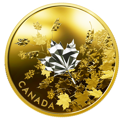 Le motif au revers, œuvre de l'artiste canadien Calder Moore, propose une relecture contemporaine et stylisée du plus populaire des emblèmes canadiens. La gravure complexe reproduit une volée de feuilles d'érable multifacettes : toutes sont composées de formes géométriques, ce qui contribue à rappeler leur ondulation dans la brise d'été. Un superbe placage d'or inverse recrée l'éclat doré d'une journée d'été. Seules l'effigie à l'avers et la feuille d'érable au centre du revers laissent entrevoir la surface en argent. Polie, celle-ci ajoute à l'ensemble un éclat remarquable – pour peu, on croirait que le soleillui-même illumine le moindre détail gravé à l'intérieur des lobes dentelés de cette feuille. L'avers, lui aussi rehaussé d'un placage d'or inverse, est à l'effigie de Sa Majesté la reine Elizabeth II, selon Susanna Blunt (P).