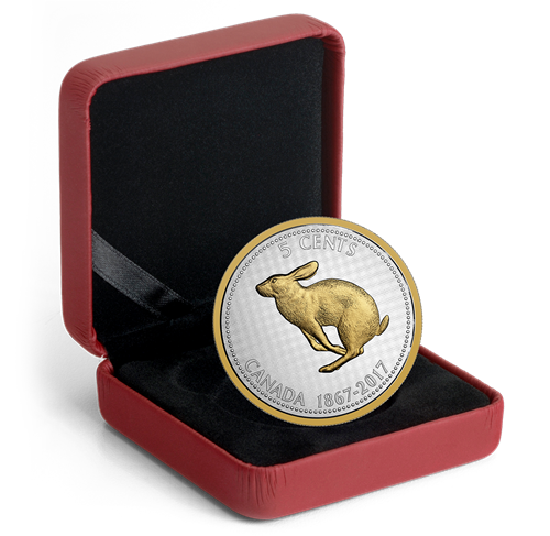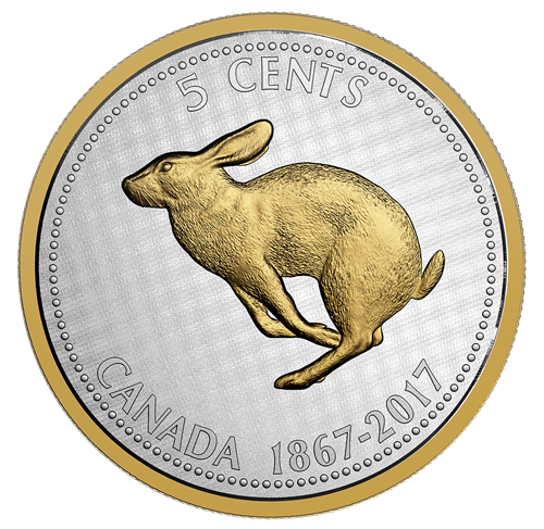Au revers est recréé le motif tant aimé de la pièce de circulation de 5 cents émise en 1967, œuvre de l'artiste canadien Alex Colville : un lapin vu de profil. Rendu avec une précision remarquable, l'animal est représenté en train de bondir. Ses pattes avant sedéploient pendant que ses puissantes pattes arrièrele propulsent. Le motif est rehaussé d'un placage d'or sélectif appliqué sur le lapin et le cordon de la pièce. Sont également gravées au revers la valeur nominale « 5 CENTS », la mention « CANADA » et les dates commémoratives « 1867-2017 ». L'avers reproduit la deuxième version de l'effigie de Sa Majesté la reine Elizabeth II, selon Arnold Machin. Le portrait de la souveraine est aussi rehaussé d'un placage d'or sélectif.