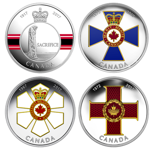 Le Régime de distinctions honorifiques du Canada nouspermet de saluer nos citoyens les plus méritants enrécompensant leurs réalisations, leur dévouement et, pour certains, leur sacrifice. Cette série de quatre pièces souligne les anniversaires marquants de quelques-unes des plus hautes distinctions civiles et militaires au pays : la Médaille du sacrifice, l'Ordre du mérite militaire, l'Ordre du Canada et la Croix de la vaillance.
