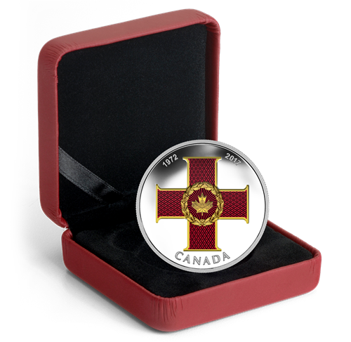 La première pièce de votre abonnement recrée fidèlement le motif de la Médaille du sacrifice, traduisant dans les moindres détails le lourd symbolisme de l'original. La médaille réelle a un diamètre de 36millimètres; la pièce, elle, a une surface de 40 millimètres, offrant une vue partielle du ruban moiré attaché à la barrette de suspension qui surmonte la médaille. Cette barrette est ornée de la couronne royale (couronne de saint Édouard), qui représente la Reine en tant que chef d'État et des forces armées du Canada. La coloration sélective recrée la bande centrale noire du ruban, qui symbolise le deuil et le chagrin, flanquée des bandes rouges représentant le sang versé, et des petites bandes blanches évoquant la paix et l'espoir d'un avenir meilleur.