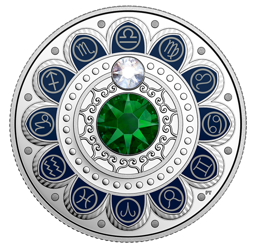 Le motif au revers, œuvre de Pandora Young, présente une attrayante combinaison de coloration sélective etde gravure qui rend avec grand art le zodiaque. Comme les astres dans le ciel, un cristal SwarovskiMD clair s'aligne sur le glyphe traditionnel qui représente une balance, symbole zodiacal de la Balance (23 septembre-22 octobre). Au centre de la pièce est incrusté un ornement Swarovski de plus grande taille; sa couleur verte symbolise les personnes nées sous ce signe d'air, qui sont reconnues pour leur impartialité, leur grâce, leur sens de la coopération et leur diplomatie. L'avers est à l'effigie de Sa Majesté la reine Elizabeth II, selon Susanna Blunt.