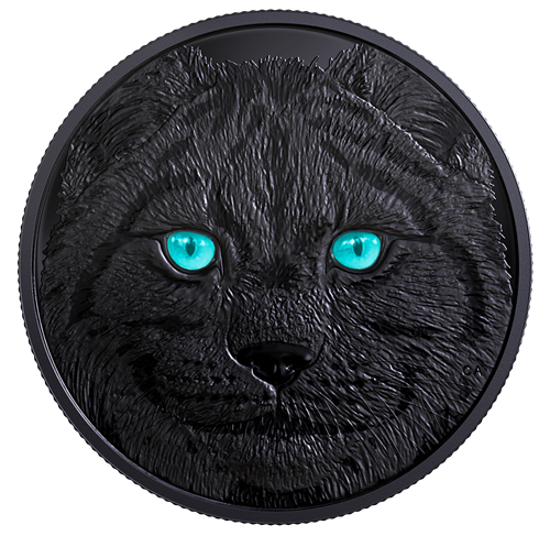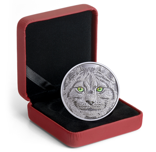 Le motif au revers, œuvre de l'artiste canadien Curtis Atwater, reproduit toute l'intensité du regard fixe et perçantdu lynx du Canada. L'image en gros plan nous propose une rare rencontre avec ce félin sauvage d'une discrétion légendaire, dont les traits fascinants sont ciselés avec une précision inouïe, de sorte qu'on en saisit même latexture. Or, c'est le regard du félin qui attire notre attention; l'effet émail novateur imite l'aspect lustré de la peinture traditionnelle, tout en présentant bien plus de variations de couleurs, cequi ajoute au réalisme des yeux du lynx.La photoluminescence leur ajoute une brillance qui rappelle leur luminosité naturelle la nuit, comme si on avait la chance de croiser le regard de ce chasseur nocturne. L'avers est à l'effigie de Sa Majesté la reine Elizabeth II, selon Susanna Blunt.