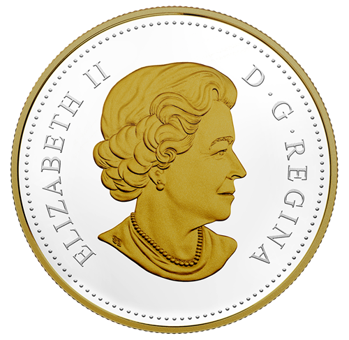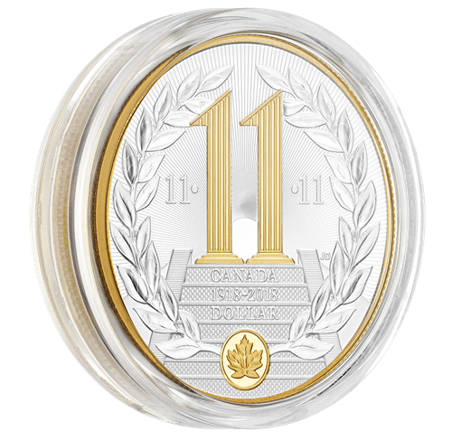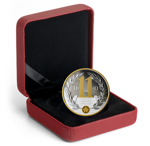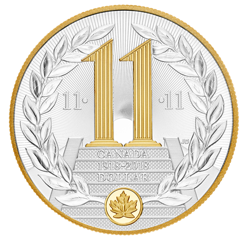 Rappelant les pièces de l’époque, le motif au revers, œuvre de l’artiste Jamie Desrochers, nous plonge dans l’esprit qui animait le pays tout entier en 1918, tout en commémorant l’heure, le jour et le mois de l’entrée en vigueur de l’Armistice. Le nombre « 11 » y figure trois fois en souvenir de la onzième heure du onzième jour du onzième mois – le 11 novembre à 11 h –, moment précis où les tirs ont cessé. Sur un champ parseméde rayons d’espoir, deux colonnes corinthiennes rehaussées d'un placage d'or sélectif se dressent au sommet d’un grand escalier et forment le nombre « 11 ». Leur silhouette rappelle vaguement le Mémorial national du Canada à Vimy, en France. Une couronne de laurier symbolise l’Armistice et la paix qu’il apporta, tandis qu’une feuille d’érable plaquée or rend un vibrant hommage aux soldats canadiens et terre-neuviens qui ont combattu lors de la Première Guerre mondiale. La mention « CANADA », l’inscription à double date « 1918-2018 » et la valeur nominale « DOLLAR » sont aussi gravées au revers, qui est bordé d’un cordon plaqué or. L’avers est à l’effigie deSa Majesté la reine Elizabeth II, selon Susanna Blunt.