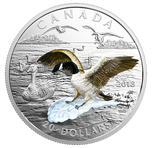 Le motif tridimensionnel de la pièce, œuvre du graveur Matthew Bowen de la Monnaie royale canadienne, représente une bernache du Canada (Branta canadensis) sur un arrière-plan gravé. L'élément à la coupe unique est le fruit d'un procédé d'impression et de relief appelé thermoformage, qui permet de reproduire en couleurs les traits distinctifs de la grande oie, jusque dans ses plus petits détails dimensionnels. Fermement apposée à la pièce, la bernache ouvre ses ailes au-dessus du motif, prête à se posersur le lac où plusieurs membres de sa bande l'attendent déjà. Son long cou est penché vers l'avant tandis que ses palmes servent de freins, créant des remous qui témoignent de la rapidité de la descente.