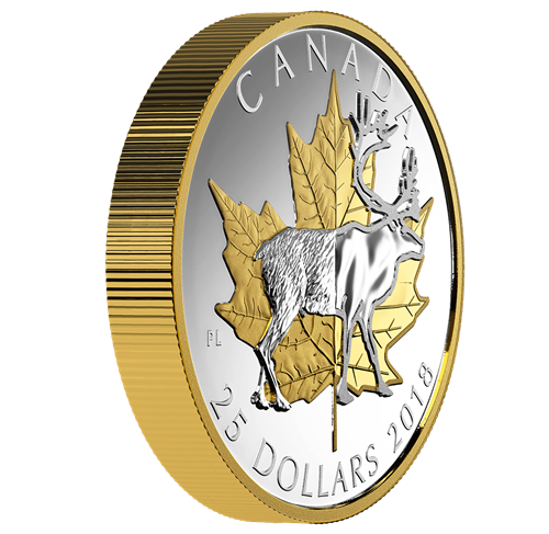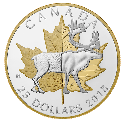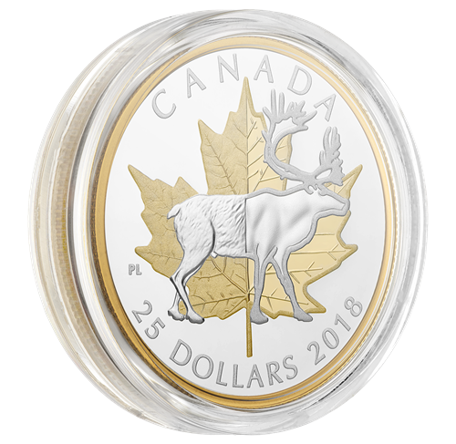 La pièce, œuvre de l'artiste canadien Pierre Leduc, est particulièrement éloquente puisqu'elle rend hommage à l'évolution de notre nation à travers ses deux emblèmes nationaux les plus éminent. Une transition se produit au centre du champ; à gauche, la représentation traditionnelle de ces symboles rappelle le passé du pays, et à droite, l'approche plus contemporaine évoque tant le présent que l'avenir. À l'avant-plan se détache le caribou, animal majestueux symbolisant le Nord canadien. Son arrière-train est détaillé et texturé, tandis que son avant-train setransforme en silhouette stylisée conférant un aspect plus moderne à l'emblème canadien. Derrière figure la célèbre feuille d'érable, dont le contour dentelé et les nervures profondes dominent le motif. La partie gauche propose une représentation plus naturelle et réaliste, qui s'apparente au revers de la très populaire pièce Feuille d'érable en argent, alors que la partie droite est d'abord affaire de symétrie et de force. Sont également gravés au revers la mention « CANADA », la valeur nominale « 25 DOLLARS » et le millésime « 2018 ». L'avers est à l'effigie de Sa Majesté la reine Elizabeth II, selon Susanna Blunt.