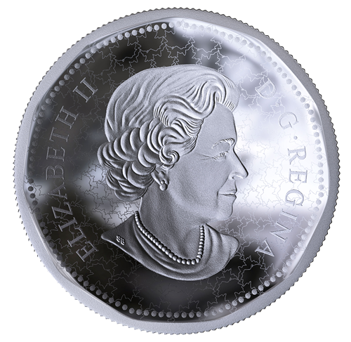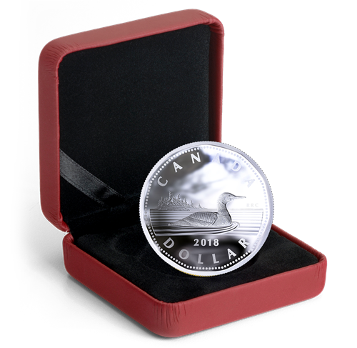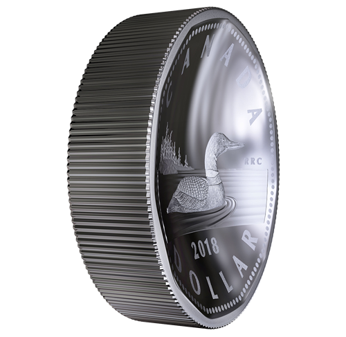 Cette pièce de 1 $ en argent pur à 99,99 % pèse 10 onces et fait 60 millimètres de diamètre. Une technologie novatriceconçue par le laboratoire de R-D de la Monnaie royale canadienne lui confère plusieurs caractéristiques exceptionnelles. Dans un style réinventé, ce piedfort possède non pas une, mais deux faces concaves. De plus, la courbure totale de chaque côté est de 6,3 millimètres, et l’épaisseur de la tranche est de plus de 16 millimètres, ce qui veut dire que cette pièce est plus épaisse que nos pièces de 1 kilogramme. Le motif et la forme hendécagonale (11 côtés) sont empruntés à la pièce de circulation canadienne de un dollar. L’image emblématique, œuvre de Robert-Ralph Carmichael, présente unplongeon huard stylisé nageant sur un lac, près d’une île. Lerevers porte les mentions « CANADA » et « DOLLAR », ainsi que le millésime « 2018 ». À l’avers se trouve l’effigie de Sa Majesté la reine Elizabeth II sur fond de feuilles d’érable se répétant de manière concentrique.