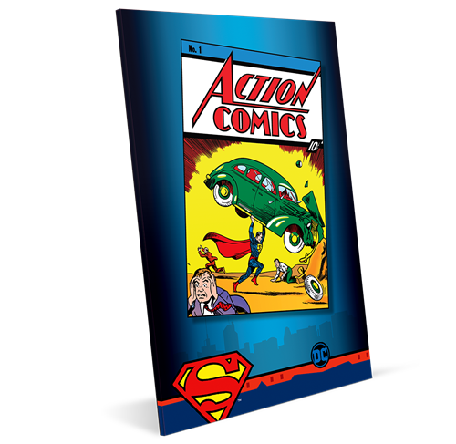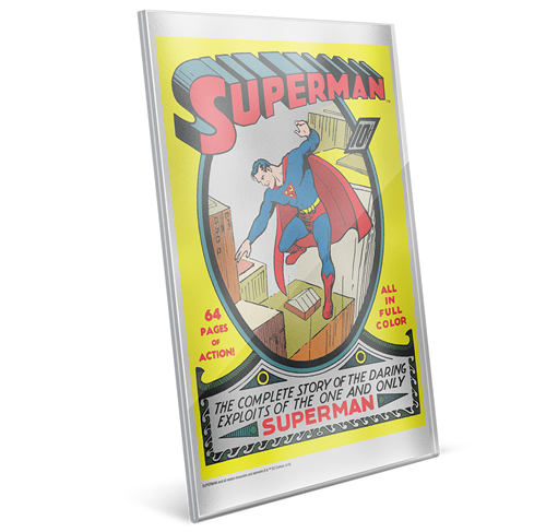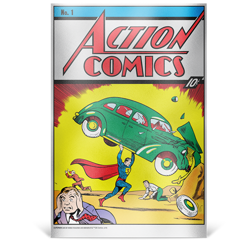 Cette feuille en argent pur célèbre le premier numéro d’Action Comics, paru en juin 1938, qui marquait les débuts de Superman. Autorisé par DC Comics, cet article de collection original présente une reproduction gravée et colorée de la couverture enlevante de ce numéro. Y figure également le numéro de tirage unique de la feuille.
