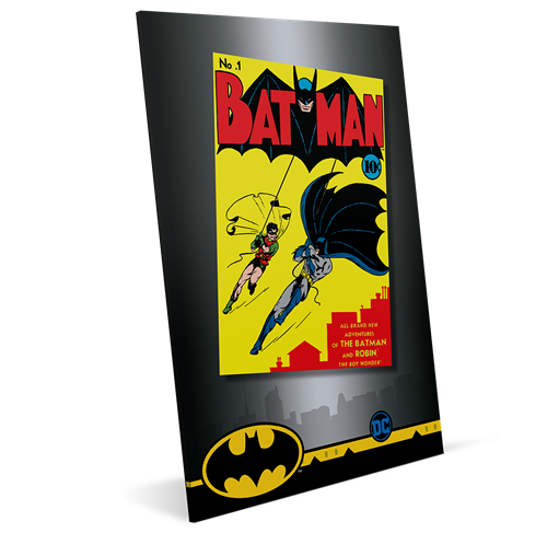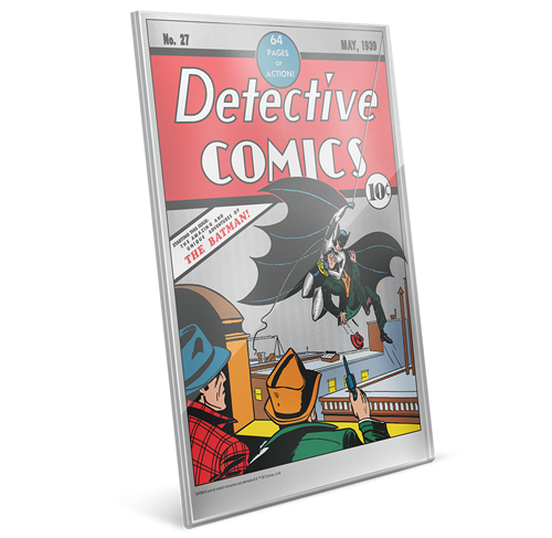 Autorisée par DC Comics, cette spectaculaire feuille en argent pur célèbre la première apparition de Batman,en mai 1939. Elle accueille une reproduction gravée et colorée de la trépidante couverture de Detective Comics #27. L’article de collection de 35 g en argent fin est présenté dans un ingénieux étui en acrylique conçu pour l’encadrer et faciliter son exposition,lequel est lui-même glissé dans une pochette thématique. Un incontournable pour tout mordu de DC Comics, de superhéros ou de Batman!