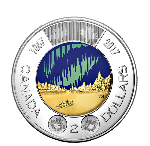 Cette pièce de circulation photoluminescente, la première au monde, a un poids métallique nominal de 6,99 grammes et fait 28 millimètres de diamètre. Œuvre de Timothy Hsia, le motif coloréintitulé La danse des esprits représente des pagayeurs avançant sur un lac sous une aurore boréale qui luit dans le noir. L’avers est à l’effigie de Sa Majesté la reine Elizabeth II,selon Susanna Blunt.