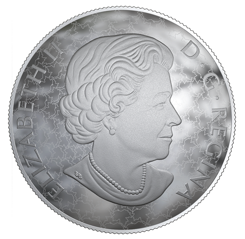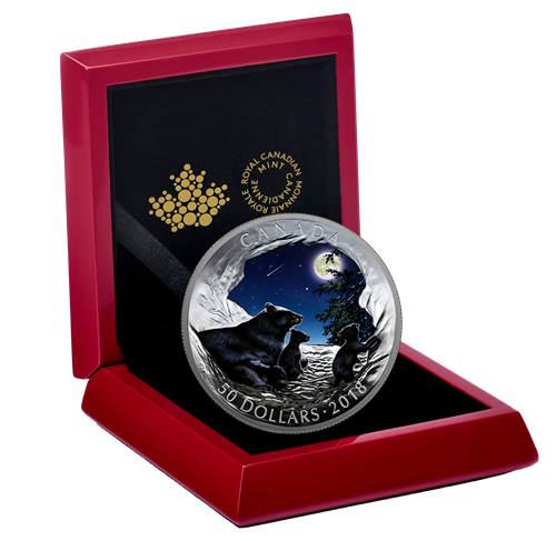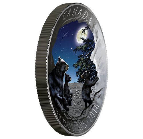 Un grand sens du calme, de la quiétude et, par-dessus tout, de l'émerveillement se dégage du motif au revers, œuvre de Maurade Baynton, quimontre la beauté d'une nuit de lune dans la nature canadienne. La forme concave de la pièce donne une vue en tunnel du ciel nocturne coloré depuis lesprofondeurs d'une caverne; ici, les détails gravés au fini épreuve numismatique imitent la lueur diffuse qui éclaire les parois rocheuses, lesquelles procurent sécurité et confort à une ourse noire (Ursus americanus) et à ses oursonscurieux. La technologie de photoluminescence joue le rôle du clair de lune, enveloppant l'épinetteblanche et découpant la silhouette de chacun des animaux, qui contemplent ensemble les étoiles – dont l'une, filante, visible seulement dans l'obscurité. La mention « CANADA », la valeur nominale « 50 DOLLARS » et le millésime « 2018 » sont gravés au revers. L'avers est à l'effigie de Sa Majesté la reine Elizabeth II, selon Susanna Blunt.